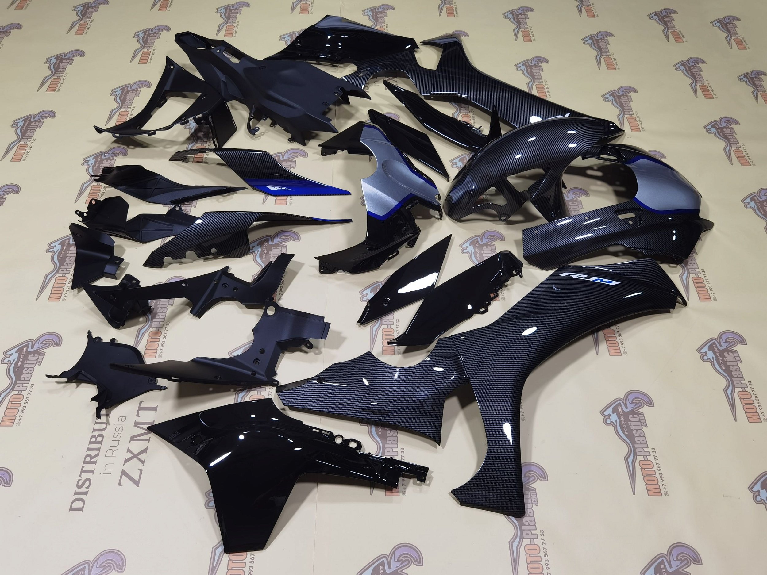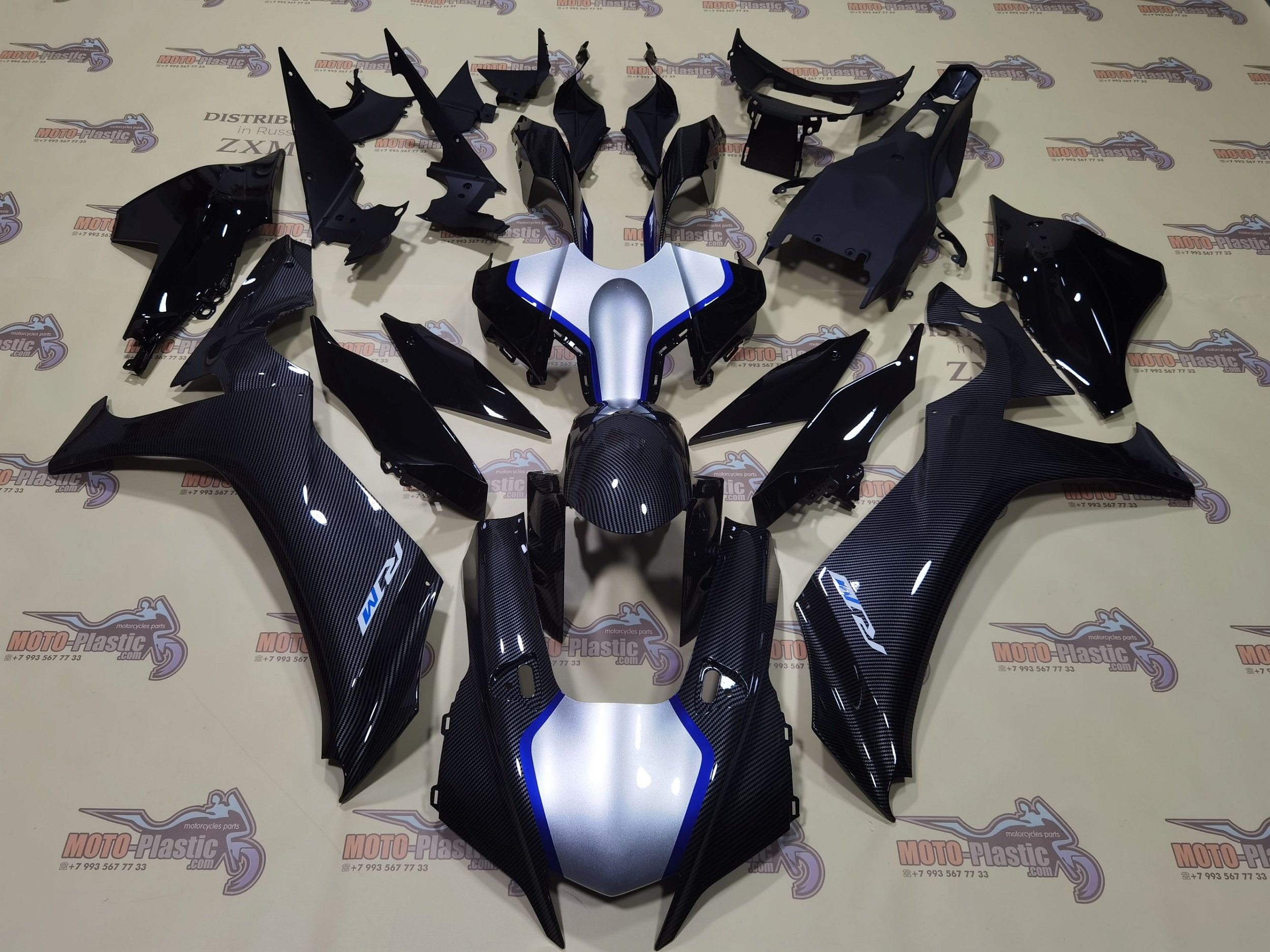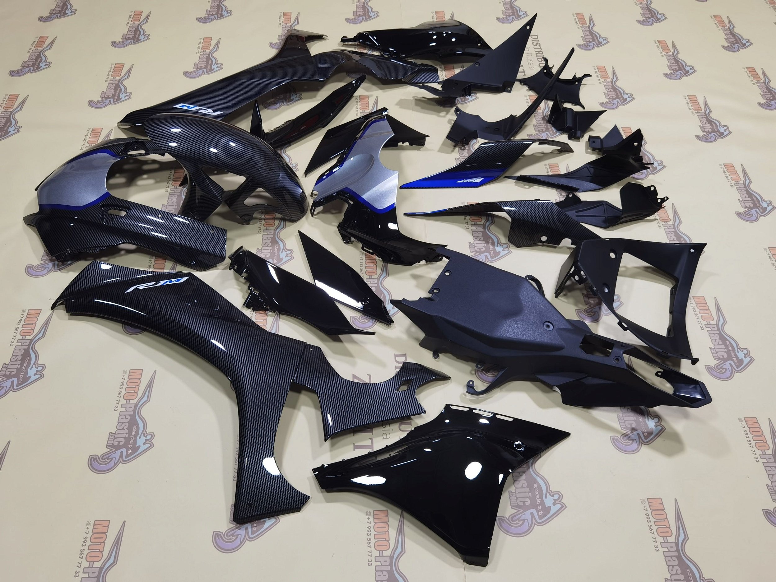 Комплект пластика Yamaha YZF R1 2021-2023. Аквапринт карбон (углеткань) Серый Синий Черный Карбон аквапринт